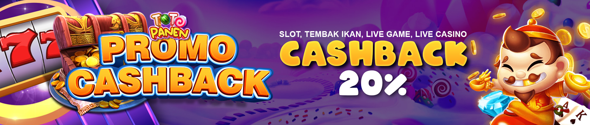 • Bonus Cashback ini hanya diberikan pada permainan SLOT, FISHING ARCADE/TEMBAK IKAN, SPORTSBOOK, LIVE CASINO,SABUNG, dan INTERACTIVE